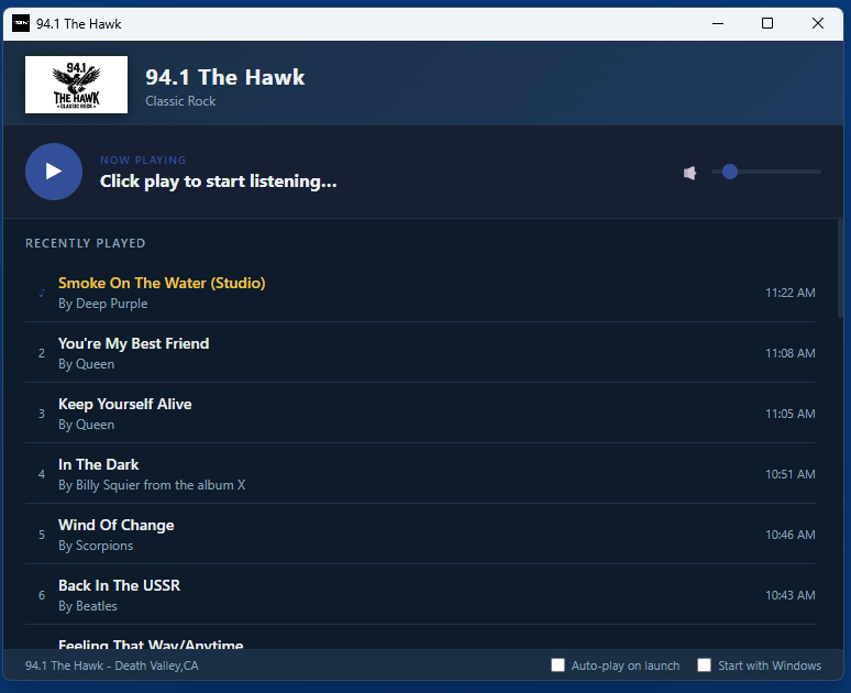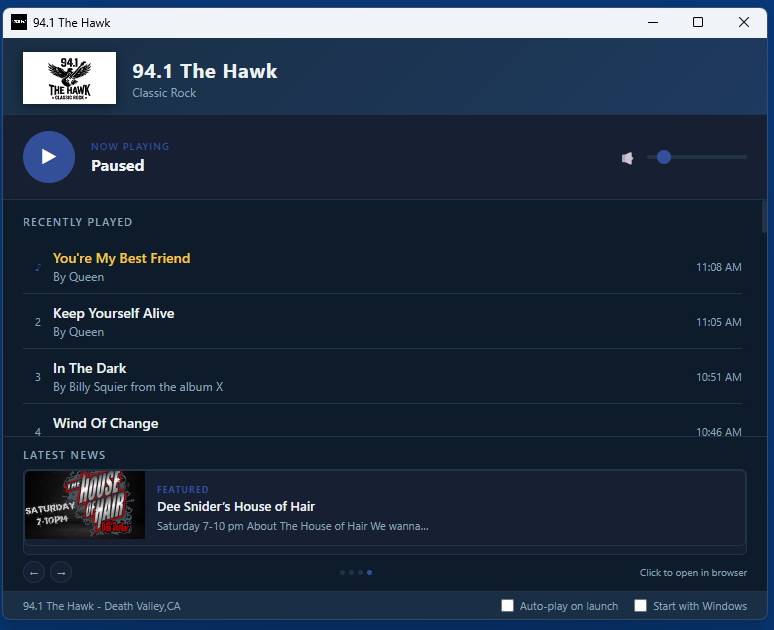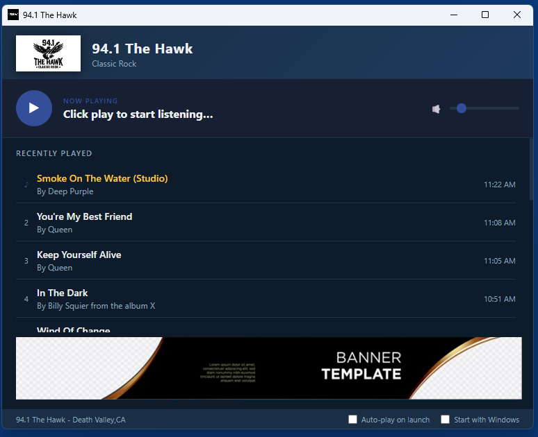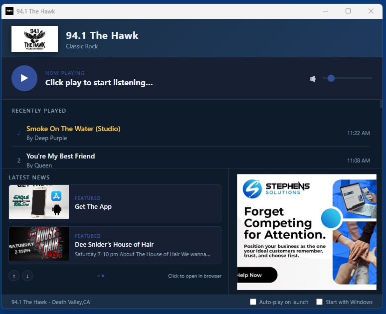 A branded native app lives in the Windows taskbar and system tray. One click and your station plays. It auto-starts with Windows, shows what's playing, displays your latest news, runs your ads, and never gets buried under a browser tab. Your station, always within reach.
